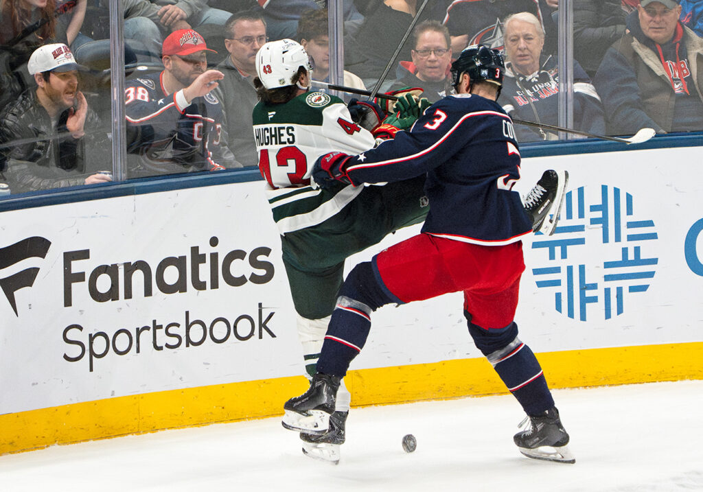 The Blue Jackets’ Charlie Coyle (3) checks Minnesota’s newly-acquired defenseman Quinn Hughes during the Wild’s 5-2 win at Nationwide Arena Thursday. Photo: Kevin Rouch