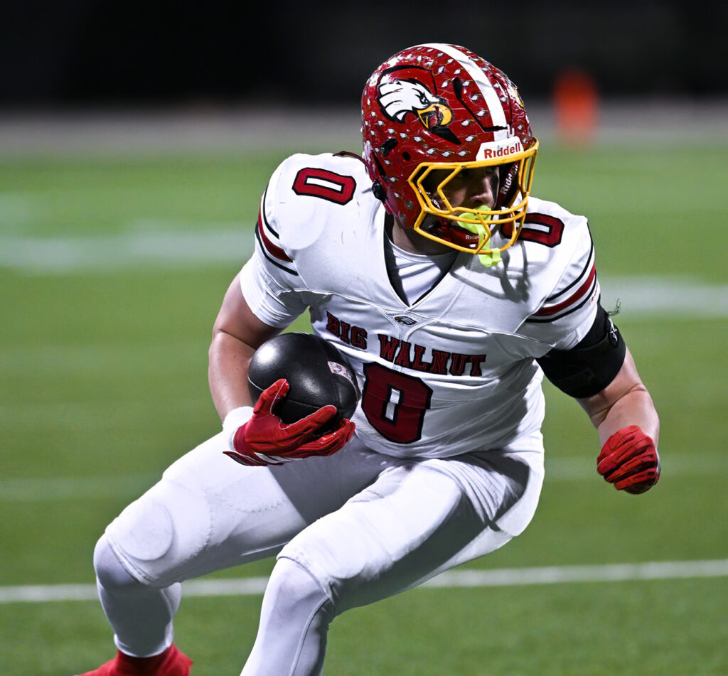 Big Walnut’s Owen Pollock, who had 86 yards receiving, runs after making a catch against Anderson Friday at Historic Crew Stadium. Photo: John Hulkenberg