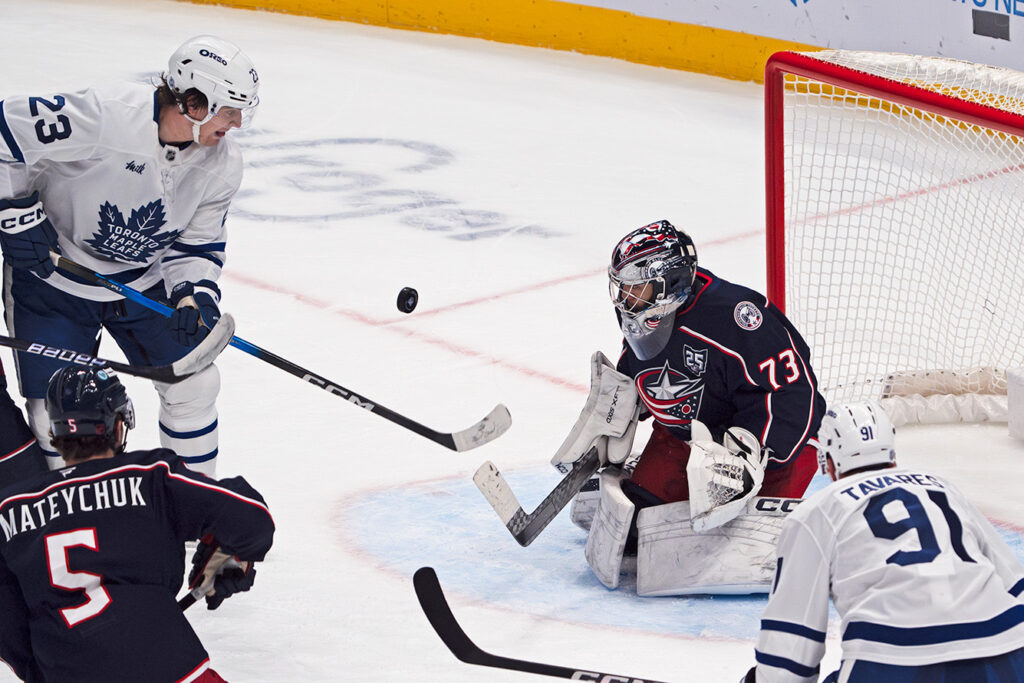 Jet Greaves (73) about to make one of his 22 saves during the Columbus Blue Jackets’ 2-1 overtime loss to the Toroto Maple Leafs Wednesday at Nationwide Arena. Photo: Kevin Rouch