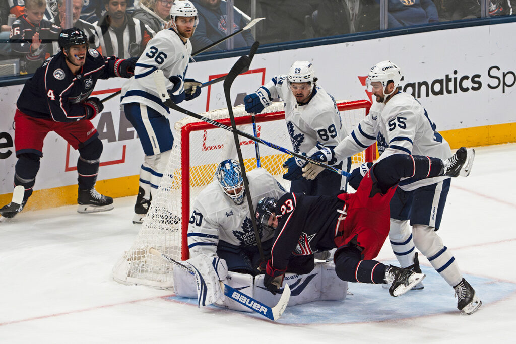 The Columbus Blue Jackets’ Sean Monahan (23) gets dumped in Toronto’s crease during their game at Nationwide Arena Wednesday. Photo: Kevin Rouch