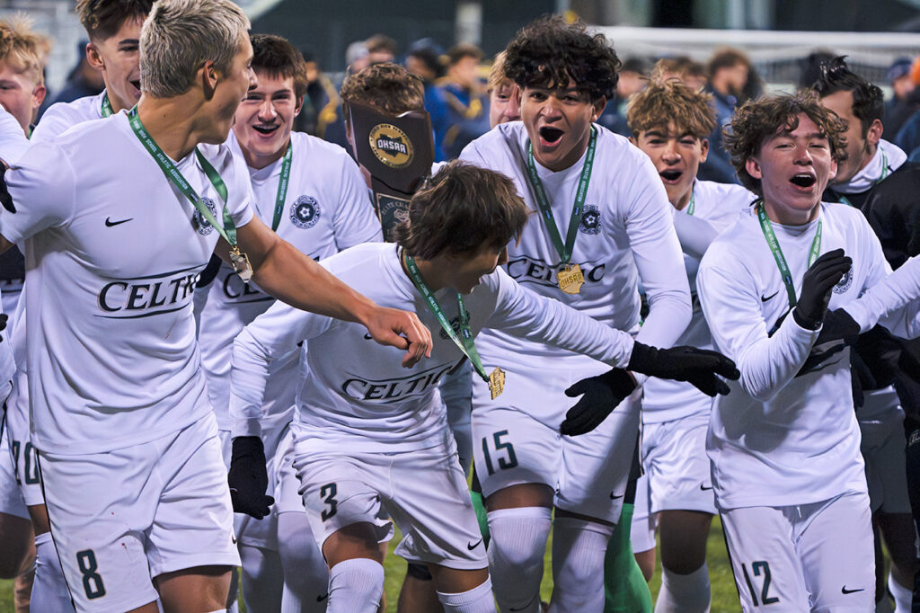 Dublin Jerome’s Brady Delmore (center) watches as his header beats the St. Ignatius defense for a goal during the Celtics’ state championship victory Monday at Historic Crew Stadium. Photo: Kevin Rouch