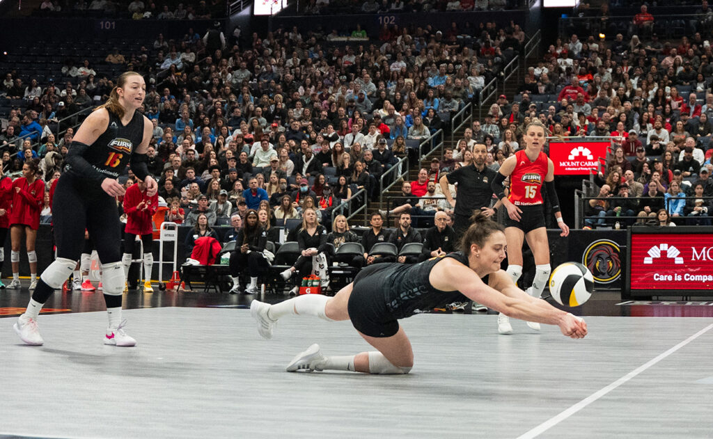 Ashley Evans (right) had another double-double for the Columbus Fury, 57 assists and 12 digs, in their heart-breaking five-set loss to Indy Saturday at Nationwide Arena. File photo