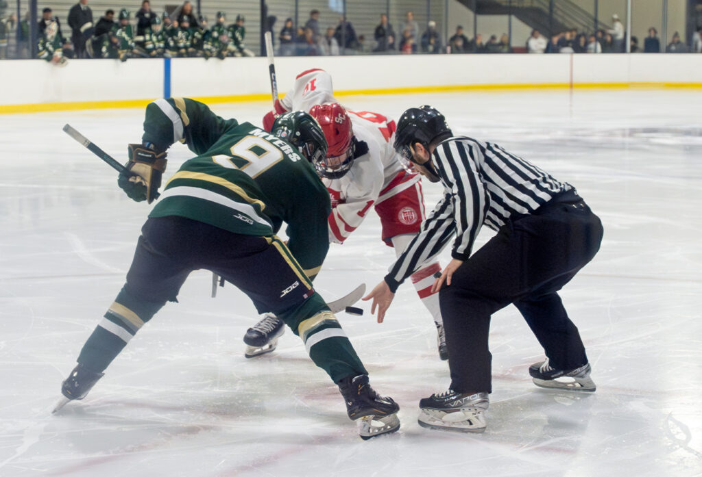 Dublin Jerome’s Luke Myers (9) faces off with St. Charles’ William Howard during the Celts’ 2-0 regional final win at the OhioHealth Ice Haus Sunday. Photo: Kevin Rouch