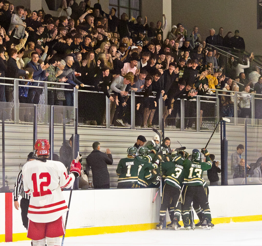 The Dublin Jerome Celts and their student section celebrate the first of their two goals during their regional final win over St. Charles Sunday at the OhioHealth Ice Haus. Photo: Kevin Rouch