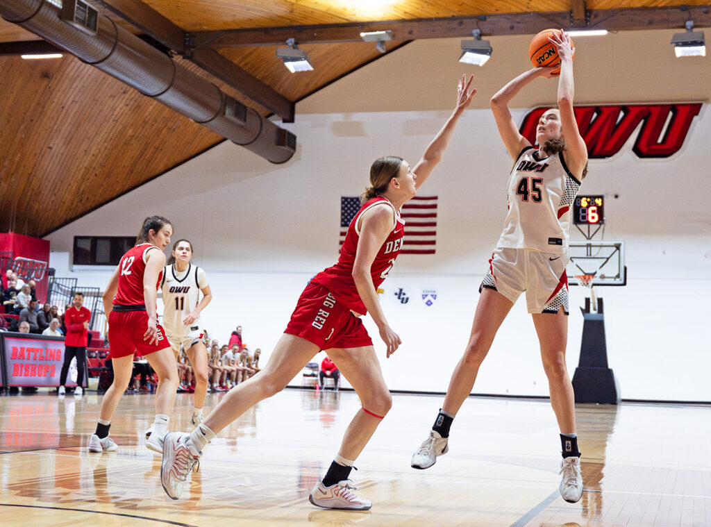 Ohio Wesleyan’s Macy Miller (45) led all scorers Saturday with 24 points during the Bishops’ 72-65 win over Denison at Branch Rickey Arena. Photo: Kevin Rouch