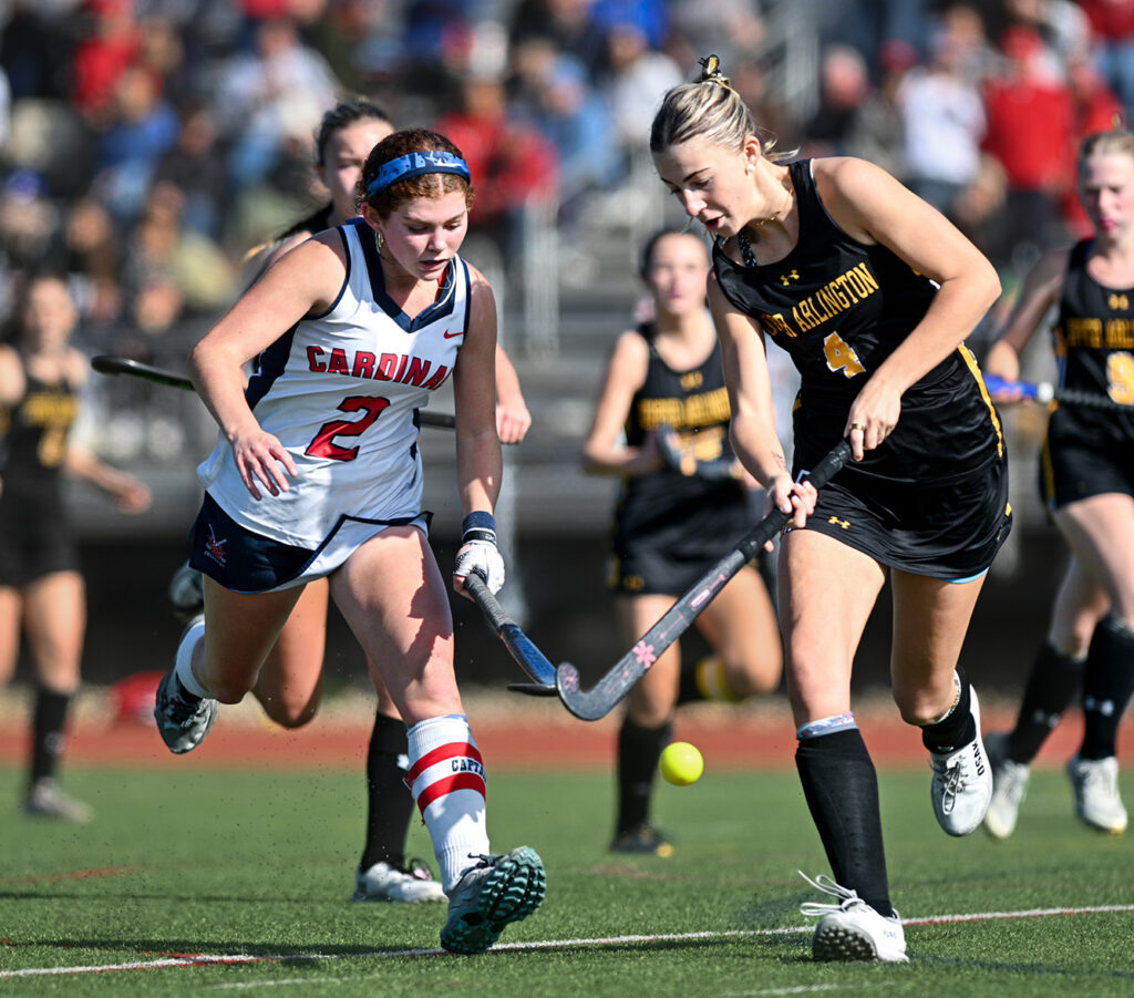 Upper Arlington’s Evie Ruma (4) moves downfield with Thomas Worthington’s Sophia Borghese (2) defending for the Cardinals during their game Saturday. Photo: John Hulkenberg