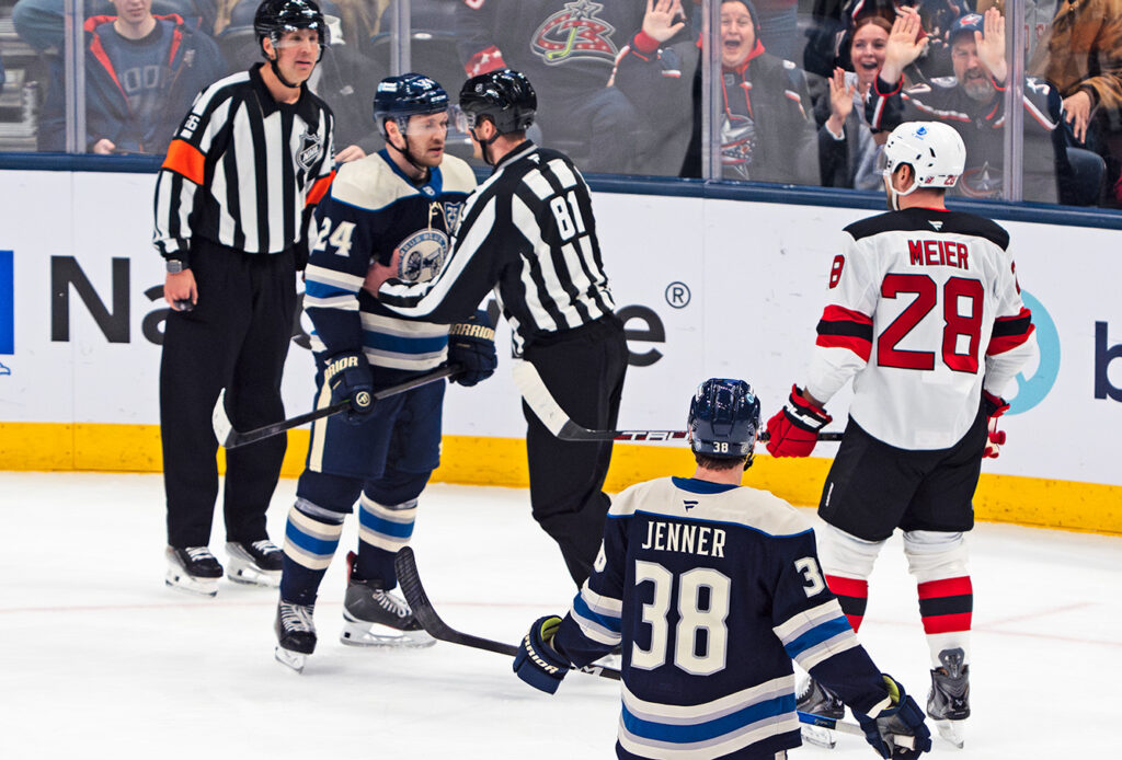 Mathieu Olivier (24) is held back by officials after he taking umbrage with New Jersey’s Timo Meier during the Blue Jackets’ game at Nationwide Arena Wednesday. Photo: Kevin Rouch